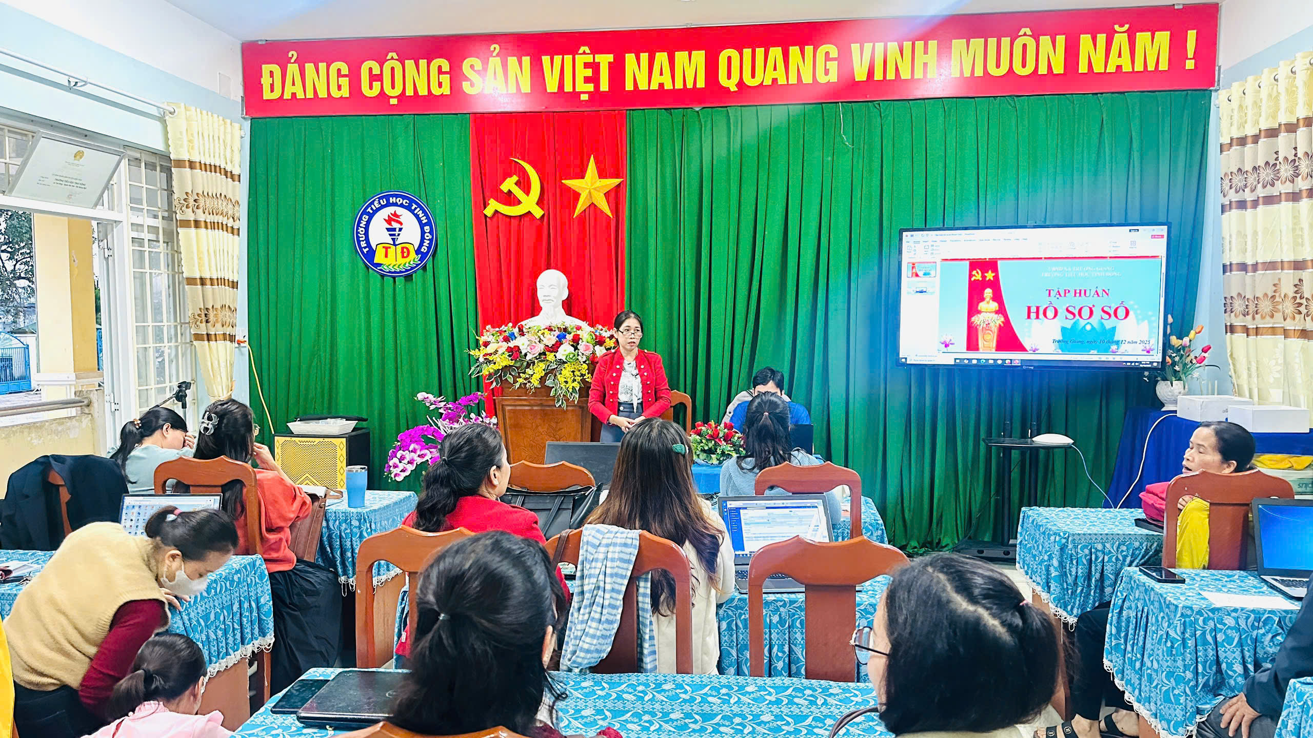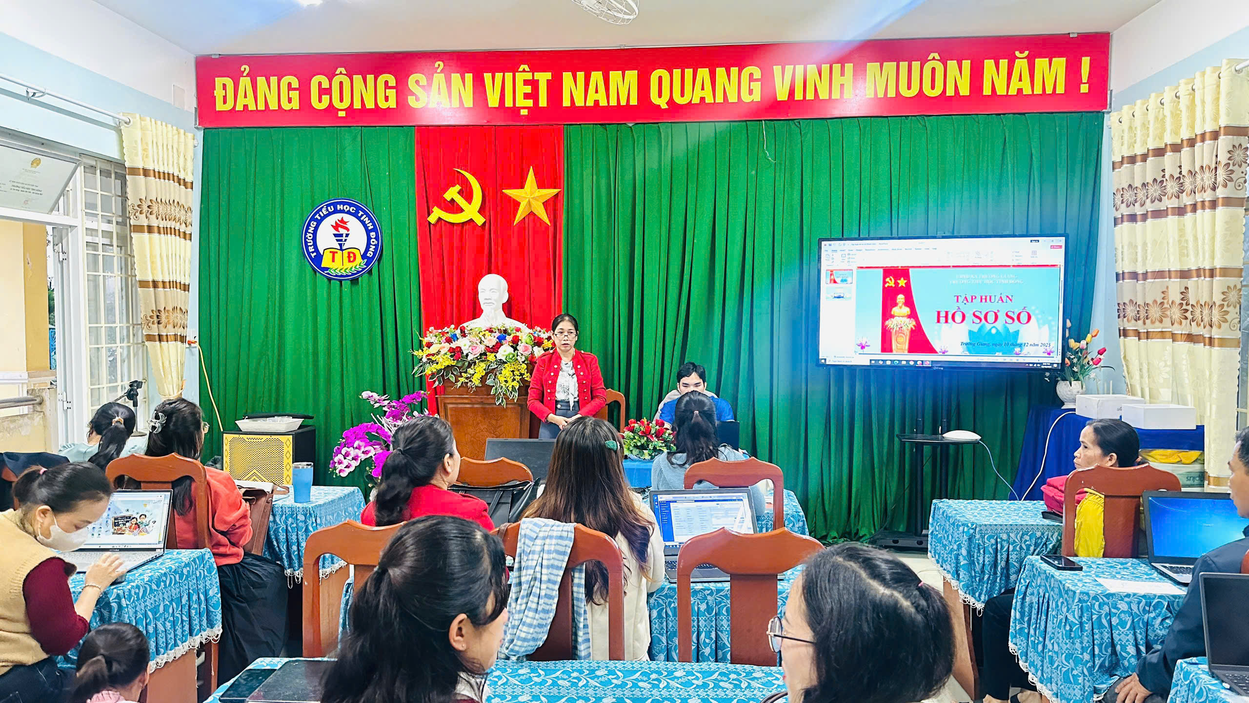 Thực hiện kế hoạch của nhà trường và nhằm nâng cao năng lực ứng dụng công nghệ thông tin trong quản lý và dạy học năm học 2025 – 2026. Vào chiều ngày 10/12/2025 Trường Tiểu học Tịnh Đông tổ chức Tập huấn phần mềm Hồ sơ số. Đây là hoạt động thiết thực giúp giáo viên tiếp cận, sử dụng hiệu quả các phần mềm và quy trình số hóa hồ sơ, góp phần nâng cao chất lượng trong công tác quản lý, giảng dạy giai đoạn chuyển đổi số của ngành giáo dục nói chung và trường Tiểu học Tịnh Đông nói riêng.